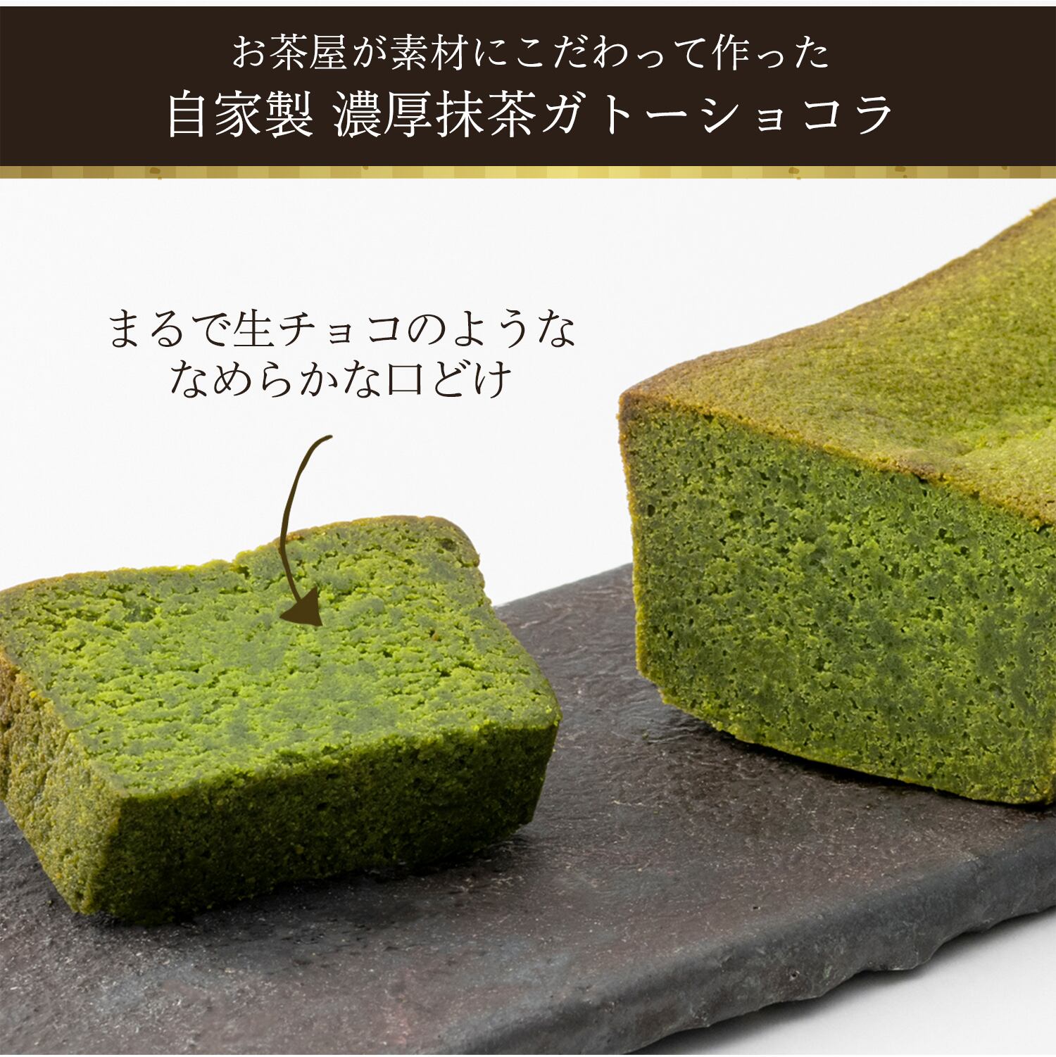 お茶屋が素材にこだわって作った本格抹茶ガトーショコラ。宇治抹茶はもちろん、ホワイトチョコレートにもこだわりました。まるで生チョコのような口どけ、しっとり濃厚、甘さ控えめで、大人はもちろん、お子様にもご好評いただいております。素材の味を大切にいています。