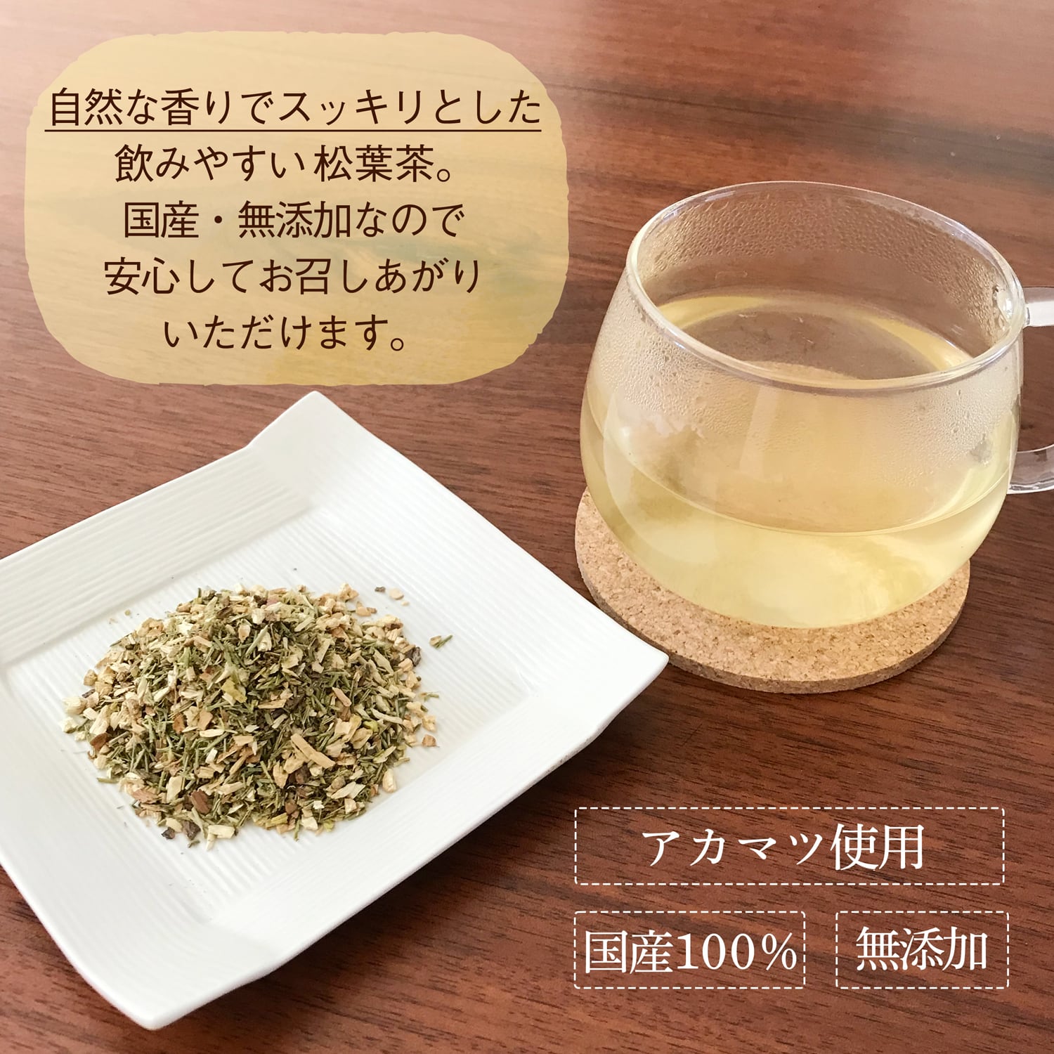 当店の松葉茶は、葉と枝をブレンドしております。ハーブティーのようにすっきりとしていて飲みやすいのが特徴です!